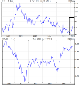Przyczyną jest zapewne kontynuacja wzrostów cen ropy naftowej. Optymiści zakładali, że ceny ropy Brent – które poszły w górę z 70 dolarów za baryłkę do 80 dolarów – uspokoją się na tym poziomie. Ale wciąż idą w górę – dziś o kolejne 6-7%. Do prognozowanych przez amerykańskie banki inwestycyjne poziomów 110-120 dolarów za baryłkę jeszcze sporo brakuje, ale cena 90 dolarów za baryłkę już majaczy na horyzoncie. Gorzej, że nie widać żadnych czynników, które mogłyby zatrzymać jej wzrost. Na górnym wykresie kurs ropy Brent, a na dolnym – ile dolarów trzeba zapłacić za jedno euro.