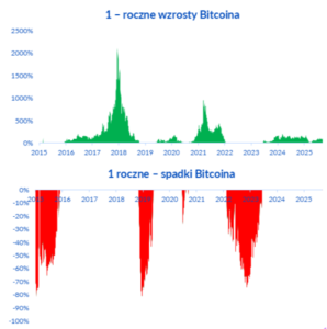 Ale jeśli ktoś chce zdywersyfikować portfel o tego typu aktywo… Dlaczego nie? Aczkolwiek trzeba pamiętać, że średnioroczna wahliwość ceny bitcoina od 2014 r. wynosi 74%, podczas gdy analogiczny wskaźnik dla indeksu S&P500 wynosi 15%. Dlatego jeśli ryzyko ryzyko portfela ma nie „wystrzelić” w kosmos, to udział bitcoina w nim nie powinien przekraczać 3-5% (w moim portfelu to niecałe 2%).