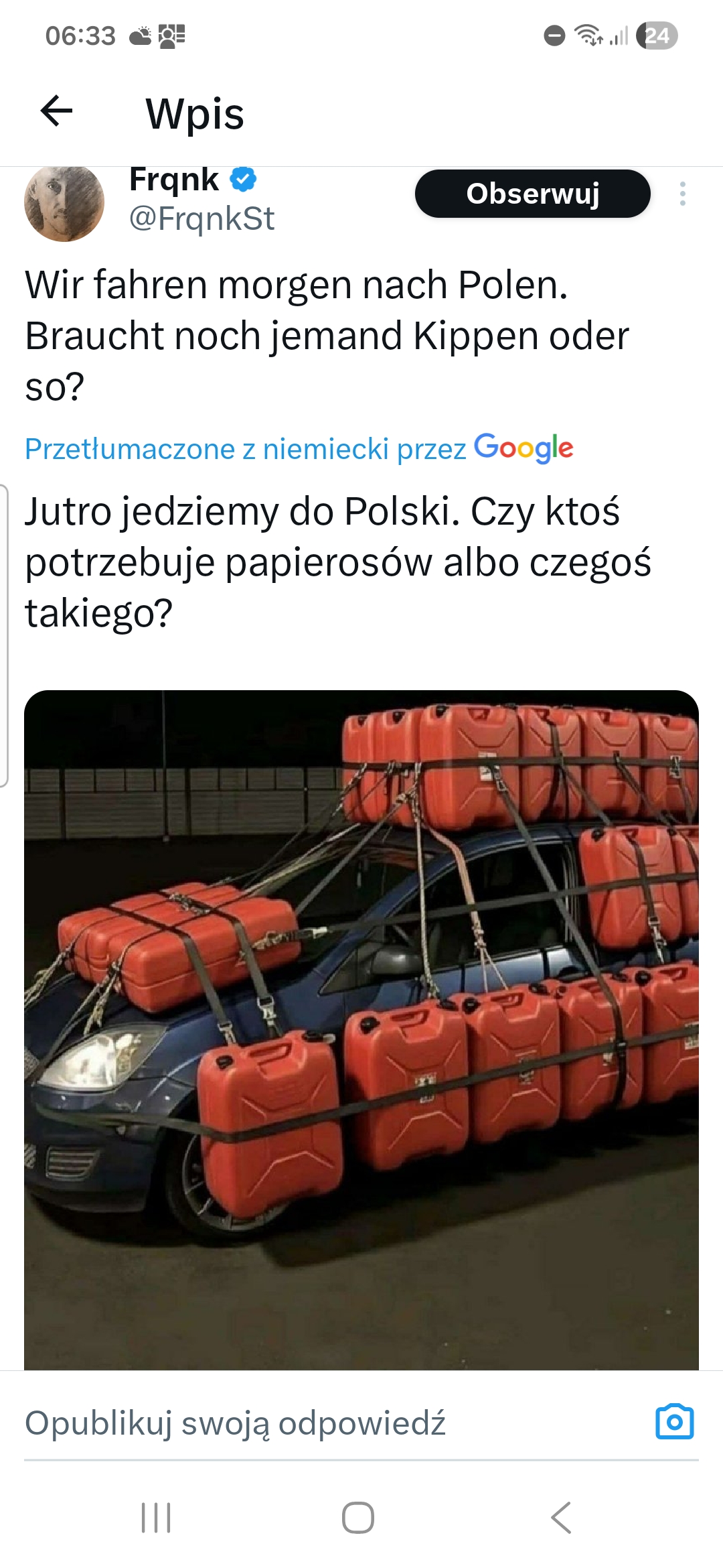 Odpowiedź na pierwsze pytanie brzmi: „to zależy”. Duże stacje paliw kupują paliwo z hurtowni co 1-2 dni, mniejsze co 3-5 dni. Więc nie każda musiałaby z dnia na dzień podnosić ceny. Z tego, co piszecie, na wielu stacjach podwyżki są szybsze i większe, niż to, co mogłoby wynikać z cen hurtowych paliwa. Czyli większe, niż 6-7% w ciągu czterech dni (zmiana średniej ceny według Automarket.pl od poniedziałku do czwartku) i więcej niż 12% (zmiana ceny hurtowej w Orlenie w okresie od piątku do piątku).