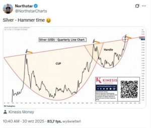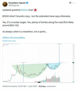 Jednak nie wszyscy analitycy udzielający się na portalu X są w tak gorącej wodzie kąpani. Są i tacy, którzy patrzą trzeźwo, z odległej perspektywy na notowania srebra – jak Northstar, którego cytujemy poniżej. Zauważa on, że poziom 50 dolarów, który jest mocnym oporem, może stać się naprawdę poważną przeszkodą dla srebra. I choć w długim terminie namawia do kupowania srebra, to ostrzega, że krótkoterminowa korekta jest wielce prawdopodobna.