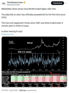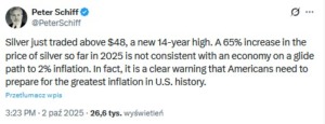 Kolejnym sygnałem alarmowym jest wysyp ekspertów, którzy wieszczą kontynuację tego wystrzału. Trwa wręcz prawdziwa internetowa „srebrna gorączka”. 100 dolarów za uncję? 200 dolarów za uncję? A może 400 dolarów za uncję? Kto da więcej? Licytacja w finansowej części portalu X (dawniej Twitter) zapala żółte światło dla wzrostowego trendu. Przywołajmy choćby wpisy słynnego fana metali szlachetnych Petera Schiffa:
