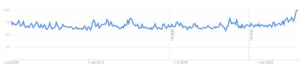 Jeśli chodzi o wyszukiwania w polskim internecie, to poziom zainteresowania słowem „srebro” rośnie sukcesywnie od kilku lat i jest już zdecydowanie wyższy niż w połowie 2020 roku. Co prawda w prehistorii Google’a poziomy zainteresowania słowem „srebro” były jeszcze znacznie wyższe niż dziś, ale według nas z różnych powodów dane sprzed 2010 roku są właściwie niemiarodajne dla obecnych czasów.