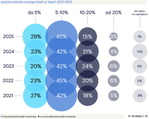 Skala podwyżek płac w 2025 roku jest wyraźnie mniejsza niż w poprzednich dwóch latach. W tym roku podwyżki najczęściej wynosiły tylko 5-10%, ale więcej niż w poprzednich latach było pracowników, którzy otrzymali podwyżki tylko do 5% wynagrodzenia. Niewielu pracowników spodziewa się natomiast podwyżek płac w 2026 roku. Jeśli już ktoś oczekuje wyższego wynagrodzenia, to gotowy jest sam zainicjować rozmowy o podwyżce ze swoim pracodawcą niż czekać na ofertę z jego strony. Zatem, drodzy pracodawcy, spodziewajcie się wizyt pracowników w swoich gabinetach.