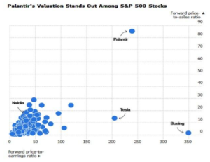 Najbardziej przeszacowaną spółką wydaje się być Palantir. firma technologiczna, która tworzy oprogramowanie do analizy dużych zbiorów danych. Kapitalizacja rynkowa Palantir wynosi nieco poniżej 500 miliardów dolarów, a jej roczne przychody stanowią niecały… 1% tej wartości (w ostatnim kwartale wyniosły 1,2 mld dolarów). Akcje spółki są wyceniane na 85-krotność wartości rocznej sprzedaży i mają oszałamiający wskaźnik P/E na poziomie 240. Analityk Morgan Stanley, Sanjit Singh, powiedział ostatnio: „To najdroższa firma, którą widziałem w swojej karierze”.