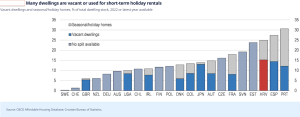 Na wykresie widać, że zsumowany udział mieszkań pustych lub wykorzystywanych do wakacyjnego wynajmu krótkoterminowego w przypadku Chorwacji byłby jednym z najwyższych w OECD, na trzecim miejscu tuż po Portugalii i Hiszpanii, na poziomie 25% zasobów. Jednak w przypadku mieszkań określonych jako vacant dwelings udział Chorwacji jest najwyższy wśród państw OECD, na poziomie 15% ogólnej liczby mieszkań i domów. To część słupka z danymi dla Chorwacji zaznaczona na wykresie na czerwono.