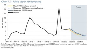 Propozycje budżetowe idą wyraźnie w kierunku spadku corocznych deficytów, czyli dziur w brytyjskich państwowych budżetach. OBR szacuje, że roczna dziura budżetowa w relacji do PKB spadnie z 5,1% w ubiegłym roku do 4,5% w tym roku, a następnie do 1,9% PKB w latach 2030–2031. Polska – dla porównania – w tym roku ma dziurę budżetową sięgającą 7% PKB, a w przyszłym prawdopodobnie będzie ona niewiele mniejsza. Brytyjczycy nie zamierzają zmniejszać swojego zadłużenia, a jedynie jego wielkość w stosunku do PKB, czyli wartości całej gospodarki (która rośnie).