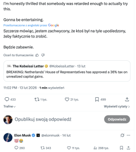 Ustawa spotkała się z krytyką głównie ze strony osób zamożnych, które na nowych zasadach mogą najwięcej stracić, i nawet mogą stanąć w obliczu wyprzedaży aktywów na pokrycie zobowiązań podatkowych. W pewnym momencie do dyskusji internatów, którzy rozprawiali szeroko o śmiesznym pomyśle holenderskich ustawodawców, wtrącił się na platformie X nawet Elon Musk. Pod wpisem jednego z uczestników dyskusji, który uznał, że z tym podatkiem „będzie zabawnie”, najbogatszy człowiek świata wstawił swój krótki, ale znaczący komentarz – roześmianą buźkę.