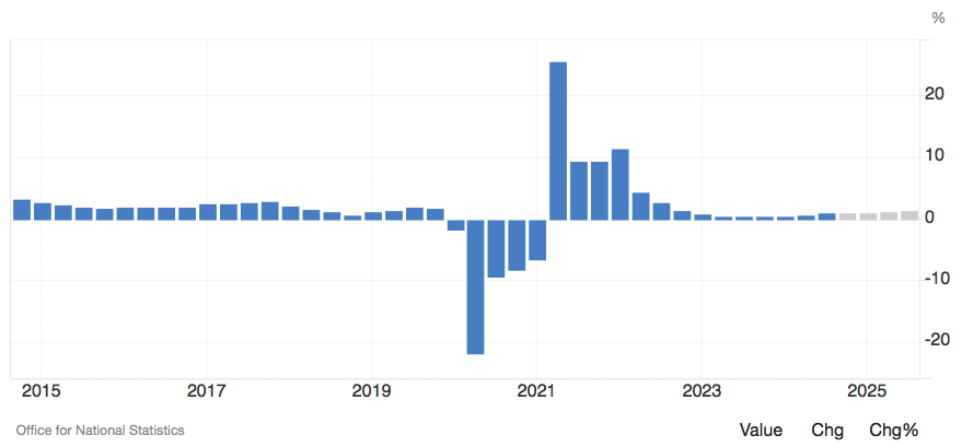 Wzrost gospodarczy w Wielkiej Brytanii nie jest bardzo wysoki, ale utrzymywał się ostatnio na poziomie ok. 1% PKB w skali roku. W dłuższej perspektywie roczna stopa wzrostu PKB po uwzględnieniu inflacji ma się zbliżać do 2%. Nie ma mowy o stagnacji czy załamaniu koniunktury, jak to się dzieje w Niemczech. Prognozy pokazują stabilny wzrost, choć dużo niższy niż przed pandemią (wtedy PKB rósł o 3% rocznie).