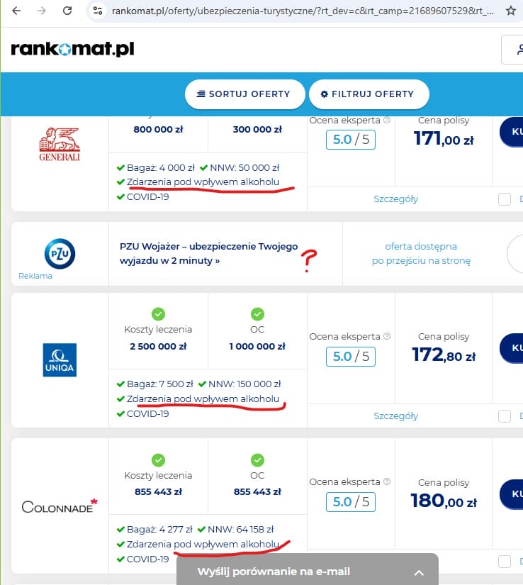 Z czego biorą się różnice w cenach i czy jest sens płacić więcej? Warto zdawać sobie sprawę z tego, że cena polisy bezpośrednio przekłada się na sumy ubezpieczenia – w przypadku tanich wersji polis są one dość niskie. Koszty leczenia – maksymalnie 10 000 euro (niecałe 50 000 zł). Ubezpieczenie NNW, czyli od następstw nieszczęśliwych wypadków – raptem 2000 euro (w tym śmierć – 1000 euro). Prawdopodobnie nie będzie w tym pakiecie polisy OC w życiu prywatnym.