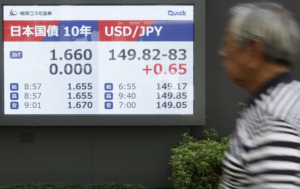 W oczekiwaniu na te posunięcia inwestorzy kupują akcje i… sprzedają japońskie obligacje (a tym samym też walutę), spodziewając się, że nowe będą miały wyższe oprocentowanie. To oznacza, że na giełdzie wzrosły rentowności japońskich papierów skarbowych (bo inwestorzy kupujący je żądają wyższego wynagrodzenia za ryzyko inwestycji w coś, co ma stałe oprocentowanie na dłuższy czas) i osłabił się jen, osiągając psychologiczny poziom 150 jenów za dolara.