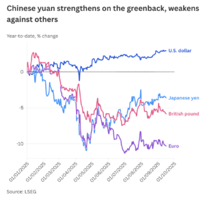Indeks dolara spadł w tym roku już o ponad 10% i jest to najgorszy wynik od dwóch dekad. Z kolei juan „zagraniczny” notowany był w połowie września już na poziomie ok. 7,1 za dolara, oscylując w pobliżu najwyższego poziomu od zwycięstwa prezydenta USA Donalda Trumpa w wyborach prezydenckich 5 listopada. Ekonomiści Goldman Sachs spodziewają się, że chińska waluta może umocnić się jeszcze do końca tego roku.