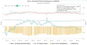 Oczekiwana aprecjacja juana względem dolara odzwierciedla też rosnące oczekiwania na obniżki stóp procentowych przez Rezerwę Federalną oraz spadające rentowności obligacji amerykańskich. Do jednej obniżki stóp przez Fed doszło we wrześniu, spodziewane są kolejne dwie jeszcze w tym roku. O tym pisaliśmy tu. W dłuższym terminie wyraźnie zmniejsza się spread w rentownościach długu między USA a Chinami, co zwiększa atrakcyjność zagranicznych inwestycji w chiński dług.
