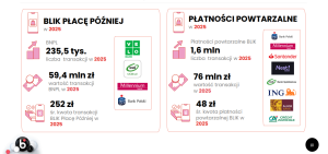 Druga nowość BLIK to płatności powtarzalne, które w 2025 roku obsłużyły 1,6 mln transakcji o wartości 76 mln zł. To rozwiązanie, które ma być „zabójcą” podpinania karty płatniczej do usług, za które płacimy cyklicznie, np. serwisów streamingowych, czy innych subskrypcji. To wygoda, która przyciąga coraz szersze grono odbiorców – usługa jest już dostępna w aż ośmiu bankach (m.in. PKO BP, ING, Santander czy Alior), co daje jej znacznie większy zasięg startowy niż w przypadku płatności odroczonych. Tu również ambicje są takie, by usługa docierała coraz dalej.