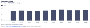Ciekawe są też statystyki dotyczące dynamiki nakładów na zdrowie. W latach 2019–2024 średni roczny wzrost wydatków per capita w krajach OECD przebiegał w podobnym tempie (2,5%) jak w okresie poprzedzającym pandemię, ale z istotnymi różnicami rok do roku. Roczny wzrost w ujęciu realnym wyniósł 5% w 2020 roku i osiągnął szczyt na poziomie 8% w 2021 roku, ponieważ rządy mobilizowały fundusze na przeciwdziałanie skutkom pandemii. Wraz z wychodzeniem krajów z pandemii wydatki na zdrowie spadły średnio o około 2,5% w 2022 roku.