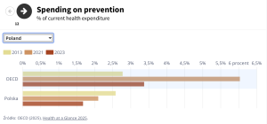 A jak wyglądamy z profilaktyką? OECD pokazuje dane, w których Polska jest na dosyć słabej pozycji. Mało tego, nasze wydatki na profilaktykę wręcz systematycznie spadają, co jest już dosyć niepokojące. Może tutaj jest pole do poważnej reformy?