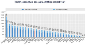 W 2024 roku średnie wydatki na opiekę zdrowotną w krajach OECD szacowano na prawie 6000 dolarów per capita, czyli na osobę, z uwzględnieniem różnic w sile nabywczej. Najwyższy poziom wydatków odnotowały Stany Zjednoczone, gdzie wydatki na osobę wyniosły ponad 14 880 dolarów, czyli 2,5-krotności średniej OECD. Na kolejnych miejscach znalazły się Szwajcaria, Norwegia i Niemcy z wydatkami na opiekę zdrowotną wynoszącymi około dwóch trzecich poziomu w USA (9300–10 000 dolarów).
