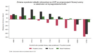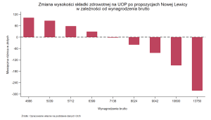 Dzięki zmianom osoba zarabiająca pensję minimalną miałaby zapłacić o 200 zł mniejszy podatek zdrowotny od obecnej składki. Zarabiający medianę wynagrodzeń miałby zyskać natomiast 100 zł. Lewica tłumaczy, że dzięki temu rozwiązaniu przedsiębiorcy będą mieć niższe koszty pracy, a przedsiębiorca, który w danym miesiącu nie zarabia, nie zapłaci podatku.
