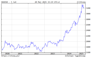 Zapowiedź rozmów handlowych pomiędzy USA a Chinami spowodowała, że rynki poczuły optymizm. A część inwestorów wycofała swoje środki z rynku złota, inkasując zyski, których jeszcze kilka miesięcy temu nie mogli oczekiwać nawet w najśmielszych snach. I szukając gdzie indziej okazji do wyższych zarobków. Jednak w obliczu trwających napięć geopolitycznych i nieprzewidywalności polityki handlowej, inwestorzy nadal trzymają rękę na pulsie, więc złoto nie chce zaliczyć głębszej korekty. Choć przecież patrząc na wykres notowań z ostatnich pięciu lat można byłoby spodziewać się poważniejszych spadków cen kruszcu.