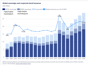 Nie tylko MFW ostrzega przed konsekwencjami rekordowej emisji obligacji. Także z prognoz OECD wynika, że w tym roku rządy (głównie państw rozwiniętych) mają zamiar wyemitować najwięcej obligacji w historii. Łącznie emisja nowych obligacji wyniesie 23,3% światowego PKB, co daje mniej więcej jedną czwartą całego światowego zadłużenia. I najwięcej od pandemicznego 2020 r.