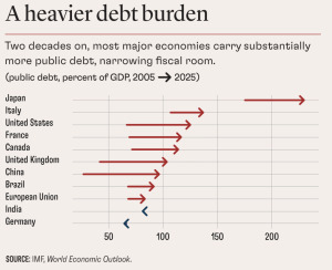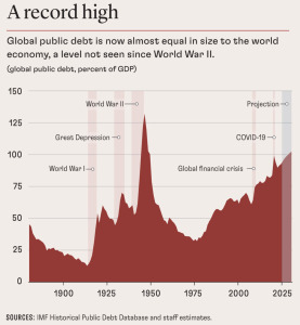 „Do niedawna rządy mogły odwlekać trudne decyzje, bo zaciągały pożyczki na dogodnych warunkach. Jednak teraz bezprecedensowy poziom zadłużenia i wyższe koszty finansowania podniosły stawkę. Jednocześnie rośnie zapotrzebowanie społeczeństw na fundusze publiczne” – piszą analitycy MFW. Globalny dług publiczny wzrósł w 2025 roku do 93,9% światowego PKB. Według MFW „jest na dobrej drodze”, aby do 2028 roku przekroczyć 100% PKB. Taki poziom zadłużenia nigdy dotąd nie występował w czasie pokoju. Rynki obligacji państwowych i korporacyjnych mają już łączną wartość 109 bilionów dolarów.