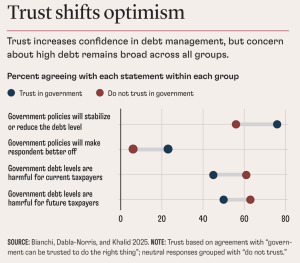 Eksperci MFW przypominają, że w niektórych społeczeństwach wystarczy wspomnieć o reformie podatkowej, a wiele osób od razu podejrzewa, że ich ciężko zarobione pieniądze zostaną przez państwo roztrwonione. Nieufność może zapoczątkować błędne koło. „Przywódcy, obawiając się negatywnej reakcji, odkładają realizację potrzebnych środków; problemy z zadłużeniem pogłębiają się, jeszcze bardziej podważając zaufanie”. Wymarzona sytuacja to taka, że obywatele uwierzą, że zaciśnięcie pasa będzie korzystne, ale to raczej rzadkość.