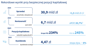 Pod koniec 2025 roku przedstawiciele zarządu PZU przekonywali, że prawdziwy potencjał wzrostu jest jeszcze przed grupą i faktycznie wyniki za 2025 rok pokazały wzrost skali, ale przede wszystkim wyższą rentowność działalności. Choć spadające stopy procentowe, rosnące opodatkowanie banków (które stanowią pokaźny kawałek działalności grupy) oraz coraz większa konkurencja o klientów ze strony pośredników ubezpieczeniowych (m.in. multiagencje) będą w przyszłości stanowiły spore wyzwania.