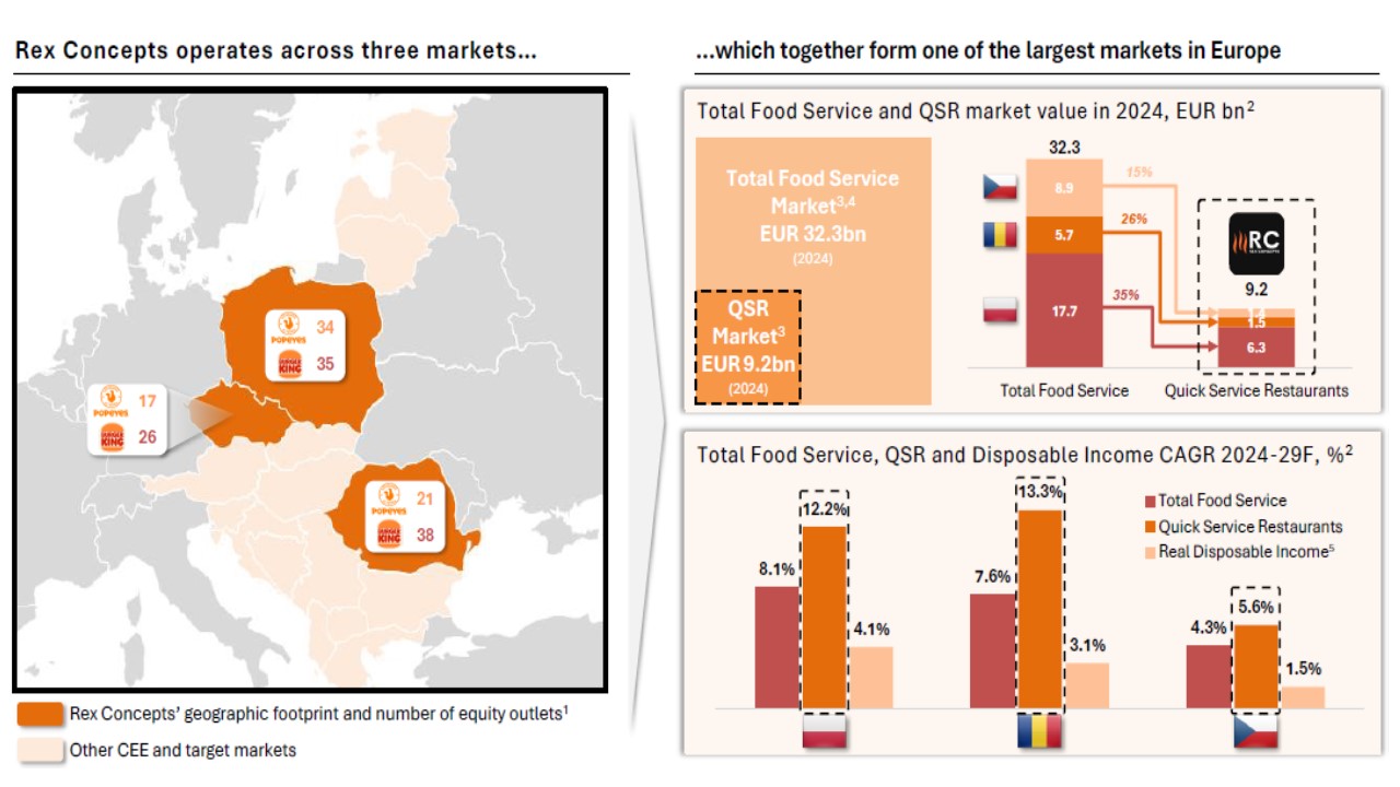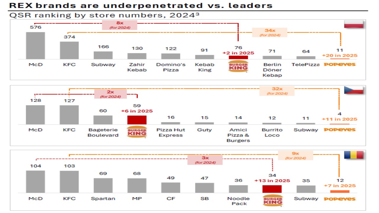 Zarząd Rex Concepts uważa, że ma ogromne pole do popisu na rynkach Europy Środkowo-Wschodniej, na których już działa. Do hegemonii dwóch liderów – McDonald’s i KFC (tylko w Polsce, Rumunii i Czechach miały w 2024 r. odpowiednio ok. 900 i ok. 600 placówek) – grupie Rex Concepts daleko (przypomnijmy – ona dysponuje siecią 270 burgerowni). Konceptualnie McDonald’s stanowi odpowiednik porównawczy dla Burger Kinga, zaś KFC – dla Popeyes.
