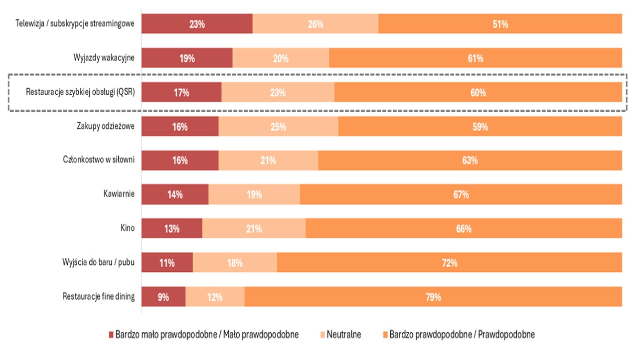 Drugim plusem może być duża odporność usług gastronomicznych w wydaniu QSR na zawirowania w gospodarce. W badaniu ankietowym L.E.K. padło pytanie, z czego najmniej chętnie zrezygnujesz, jeżeli twoje dochody się obniżą. Sondowani wskazali, że w ostatniej kolejności przestaną wydawać na streaming, wyjazdy wakacyjne i właśnie QSR.
