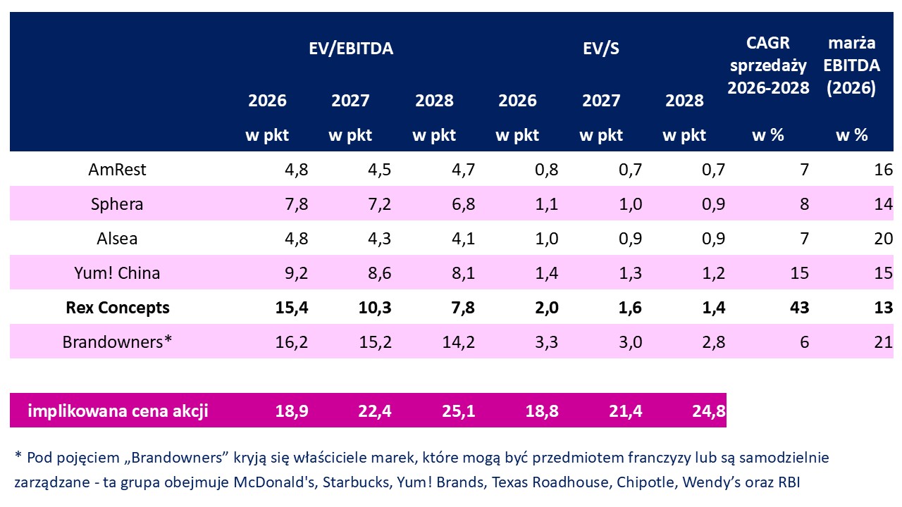 Dla danych za 2026 r. akcje Rex Concepts zdają się być warte ok. 19 zł. Zasługują na to, żeby były wyceniane przy wyższych wskaźnikach, zważywszy na projektowane tempo wzrostu skali działania. Na poniższej infografice mamy operatorów franczyzowych, których uznałem za najbardziej zbliżonych do Rex Concepts.