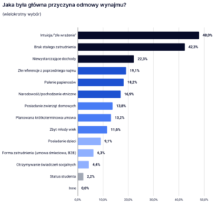 Najbardziej uderzająca jest jednak skala odmów udzielenia usługi najmu. Ponad 63% właścicieli nieruchomości przyznaje, że komuś odmówiło podpisania umowy najmu. Gdy pytamy „dlaczego?” najczęściej pada odpowiedź, że potencjalny najemca zrobił „złe wrażenie”. Aż 48% spośród tych, którzy odmówili potencjalnemu najemcy, wskazało to jako główny powód. Prawie połowa osób podjęła decyzję bez żadnych danych, opierając się tylko na swojej intuicji!