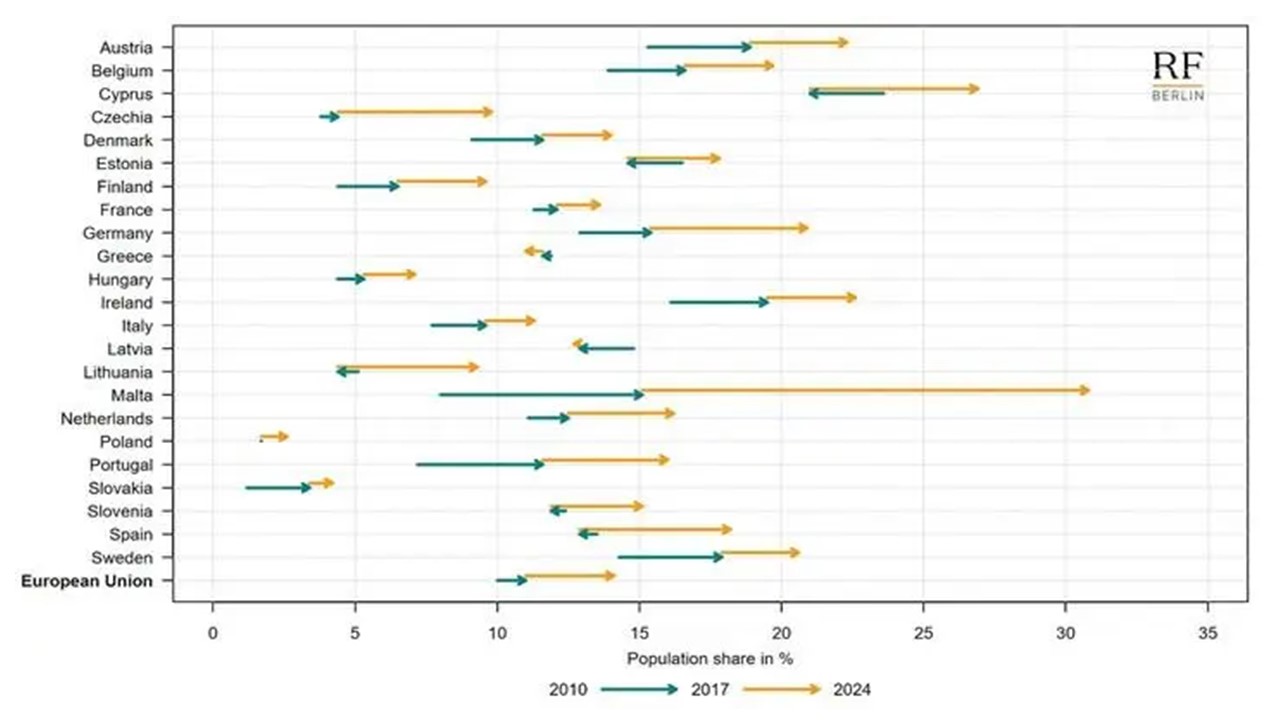 Ośrodek analityczny RF Berlin (RFB) policzył, jak wyglądały procesy asymilacji cudzoziemców w państwach europejskich w latach 2010-2024. RFB odpowiedział na pytanie, ile procent obcokrajowców wchodziło w skład danej populacji państwa Unii Europejskiej. Średnia dla całej Unii zbliża się do 15%. Najbardziej otwarte gospodarki mają już 20% i więcej migrantów. W naszym regionie Czesi i Litwini zmierzają ku 10%. Polska za to jest na szarym końcu z 3-procentowym odsetkiem mieszkańców-imigrantów.