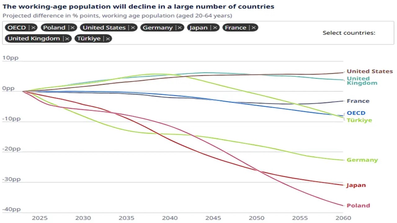 OECD niedawno opublikował swoje najnowsze szacunki dotyczące spadku liczby ludności w Polsce (w tym liczby dzieci), z którymi zapoznasz się tutaj. Do 2060 r. liczba ludności w wieku produkcyjnym w Polsce zmniejszy się o 40%, o ile państwo nie podejmie działań balansujących spodziewany deficyt. Gdy spojrzy się na poniższą infografikę, to staje się jasne, że mniej więcej od 2040 r. spadek wejdzie w najbardziej dynamiczny okres.
