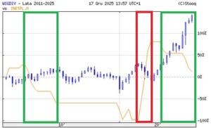 Spójrzmy na zachowanie indeksu WIGdiv. Jest to wskaźnik stopy zwrotu spółek notowanych na giełdzie, które regularnie wypłacają dywidendy. Co prawda jest on bardzo wrażliwy na politykę pieniężną, bo polski sektor finansowy ma sporą wagę w tymże indeksie, ale jednak lepszego wskaźnika powiązanego z dywidendami nie ma.