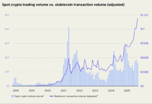 W lipcu 2025 roku Kongres USA przyjął GENIUS Act, który zapewnił ramy regulacyjne dla tej kategorii kryptoaktywów (m.in. nałożył na ich emitentów obowiązek pełnego zabezpieczenia aktywów i ich audytowania co kwartał przez niezależne instytucje). To było włączenie „zielonego światła” dla instytucji finansowych, by mogły dokonywać adopcji stablecoinów oraz rozwijać produkty finansowe wykorzystujące na różne sposoby ten rodzaj kryptowalut. Najnowsze dane pokazują, że stablecoiny nie są już używane tylko jako środek do kupowania niestabilnych kryptoaktywów, ale też są używane jako środek płatności w tradycyjnym systemie finansowym.
