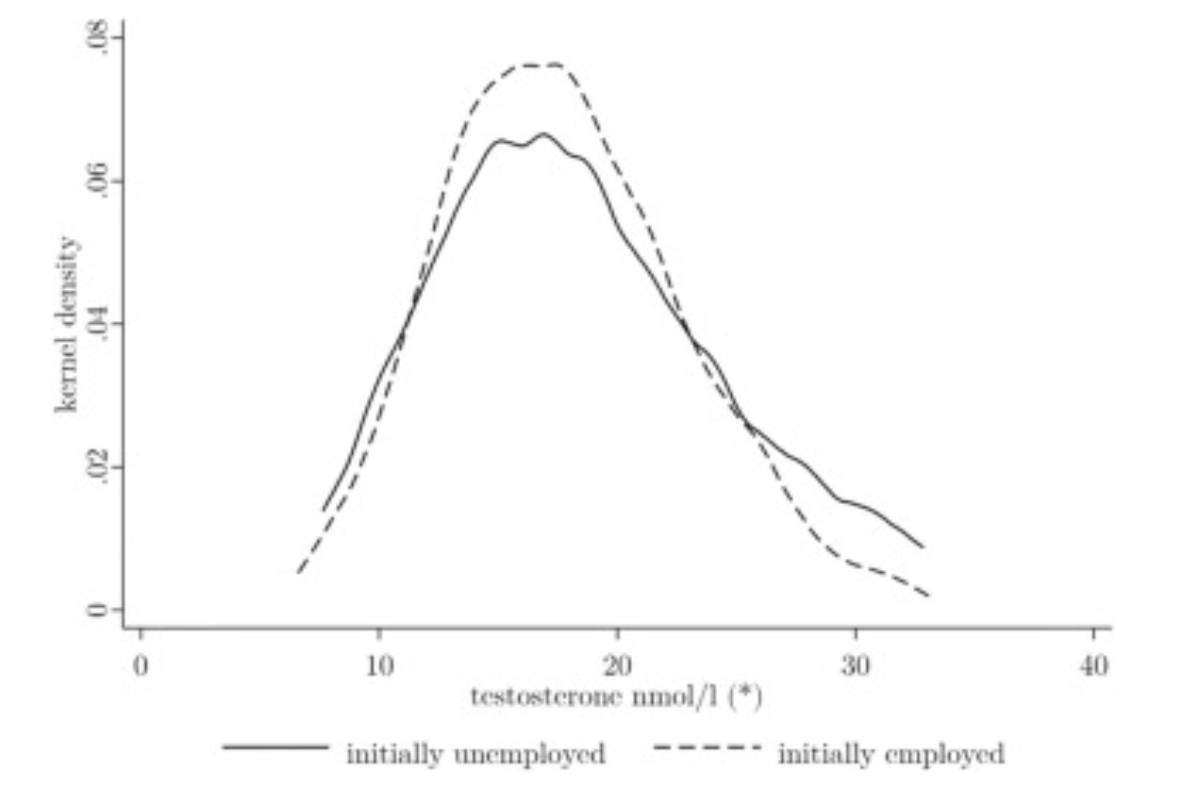 Na grafice poniżej pokazany został poziom testosteronu (nmol/l) w zależności od statusu na rynku pracy. Wartości mierzone u mężczyzn w wieku 25–64 lat z dodatnim poziomem testosteronu, u których wywiad medyczny rozpoczął się między godziną 8:00 a 20:00 i którzy byli zatrudnieni lub bezrobotni. Linia przerywana pokazuje wysoki poziom testosteronu u mężczyzn zatrudnionych.