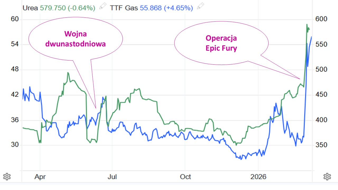 Konflikt irański ma istotne znaczenie dla branży nawozowej, ponieważ z bliskowschodniego obszaru pochodzi 44% globalnego eksportu mocznika, 27% eksportu amoniaku, czy 47% eksportu siarki. Nic dziwnego, że ceny nawozów wzrosły od chwili inwazji amerykańsko-izraelskiej na Iran. Cena mocznika od rozpoczęcia konfliktu wokół Zatoki Perskiej poszybowała o 30%, a licząc od dołka w grudniu 2025 roku – o ponad 70%.