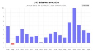 Skumulowany wzrost inflacji w USA w latach 2008–2025 wyniósł ok. 49,31%, co niewątpliwie wpłynęło na całość wydatków rządowych. W takiej sytuacji rosną oczywiście koszty wszystkiego – od wynagrodzeń przez świadczenia społeczne, emerytury i renty aż po koszty inwestycji i usług publicznych. Średnia stopa inflacji w tym okresie wyniosła ok. 2,39%.